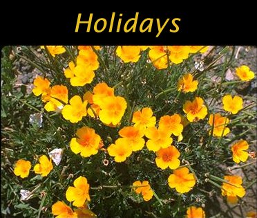 Add your own ideas for holidays to the suggestions listed below. Write to government officials to obtain lists of your state and local region’s holidays. For example, in California we celebrate "California Poppy Day" on April 6. I don’t let this day pass without finding poppies to admire, tame ones in a residential yard or, preferably, wild ones in a natural area! Similarly, you can personalize any holiday. And, of course, there’s your birthday--a most special ‘holiday’ and a wonderful time for reflecting on the gift of Life.